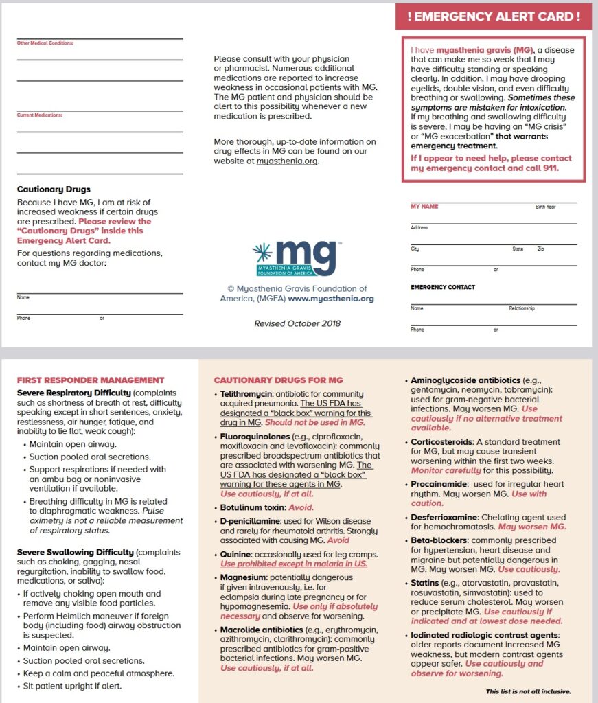 Vous voyagez ? Pensez à avoir cette carte d’urgence myasthénie que propose la MGFA. Vous pvez la télécharger et l’imprimer