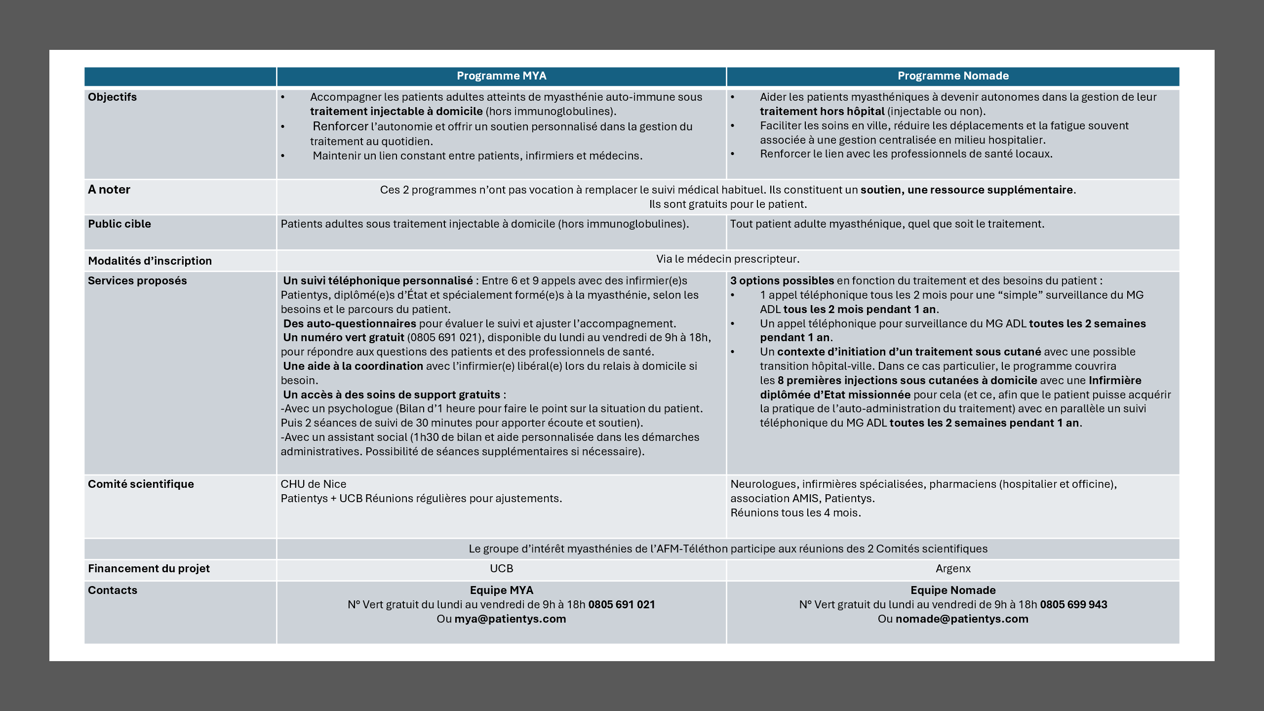 Pour répondre à cette attente, deux programmes d’accompagnement dédiés à la myasthénie ont été mis en place :